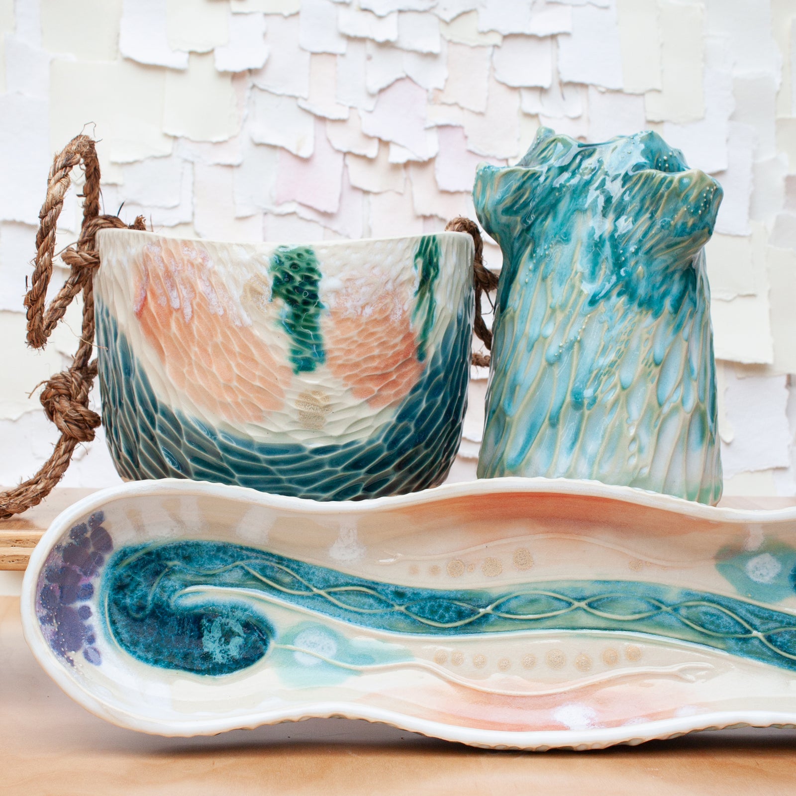 I am an artist primarily working in ceramics and watercolor. My practice involves immersion in natural ecosystems, poetic writings, and intuitive drawing to develop ideas. This process often creates abstract, sculpted, ceramic wall relief murals and layered, ephemeral paintings exploring natural systems, animism, and poetic emotional landscapes. My work pulls forms from geological processes, native ecosystems, textures and patterns found in the world and cosmos. The forms feel familiar, as abstract landscapes that we move through—attempting to communicate the transitory complexity of human and natural connections.