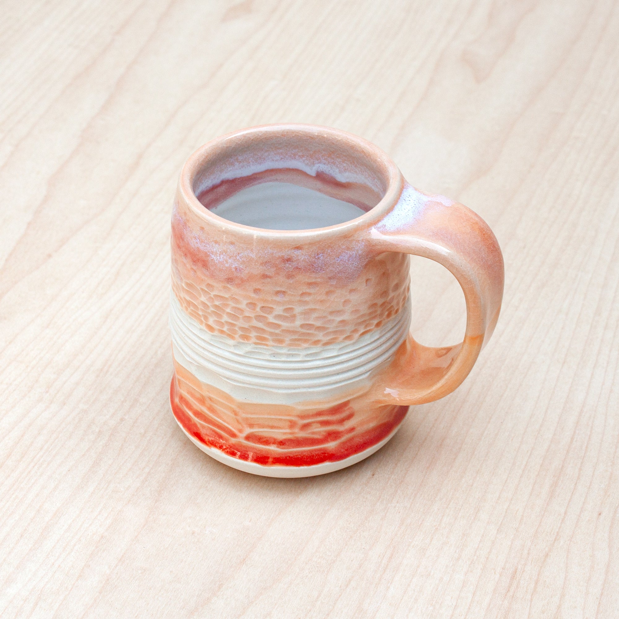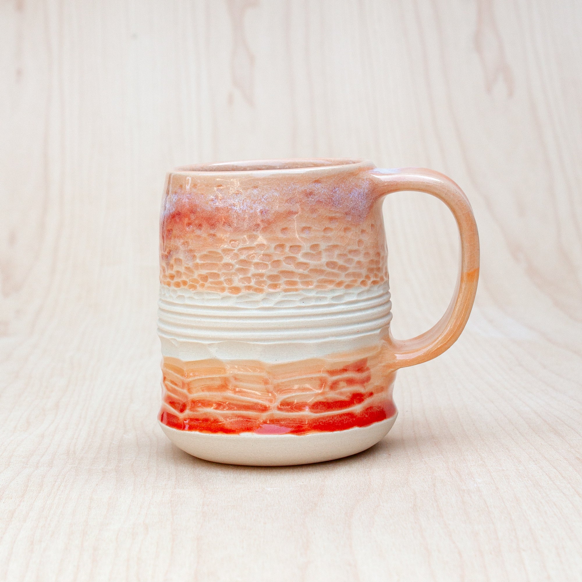 Detailed texture inspired from caves + beach rock formations + the horizon. Glazed in evocative colors, hand carved and textured.