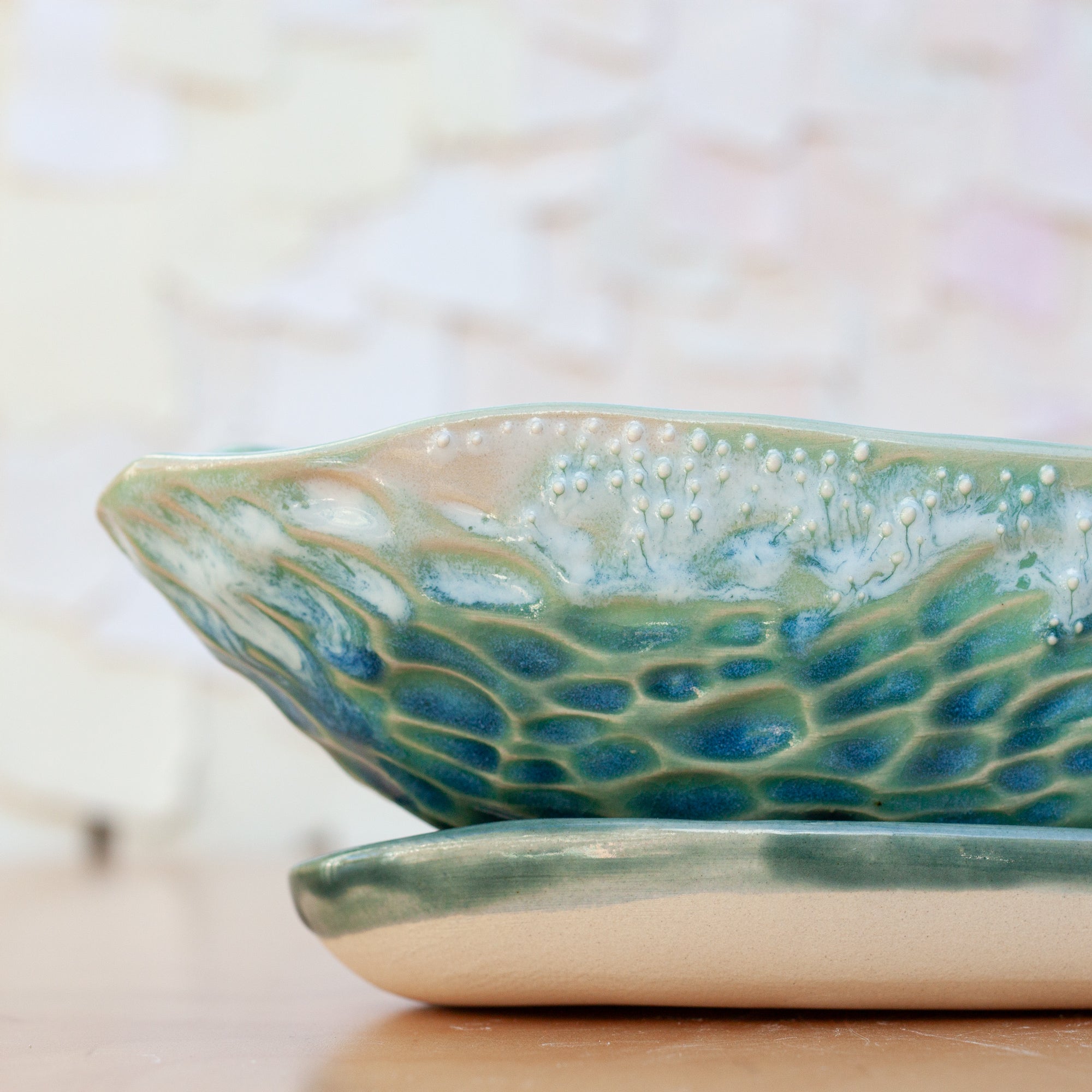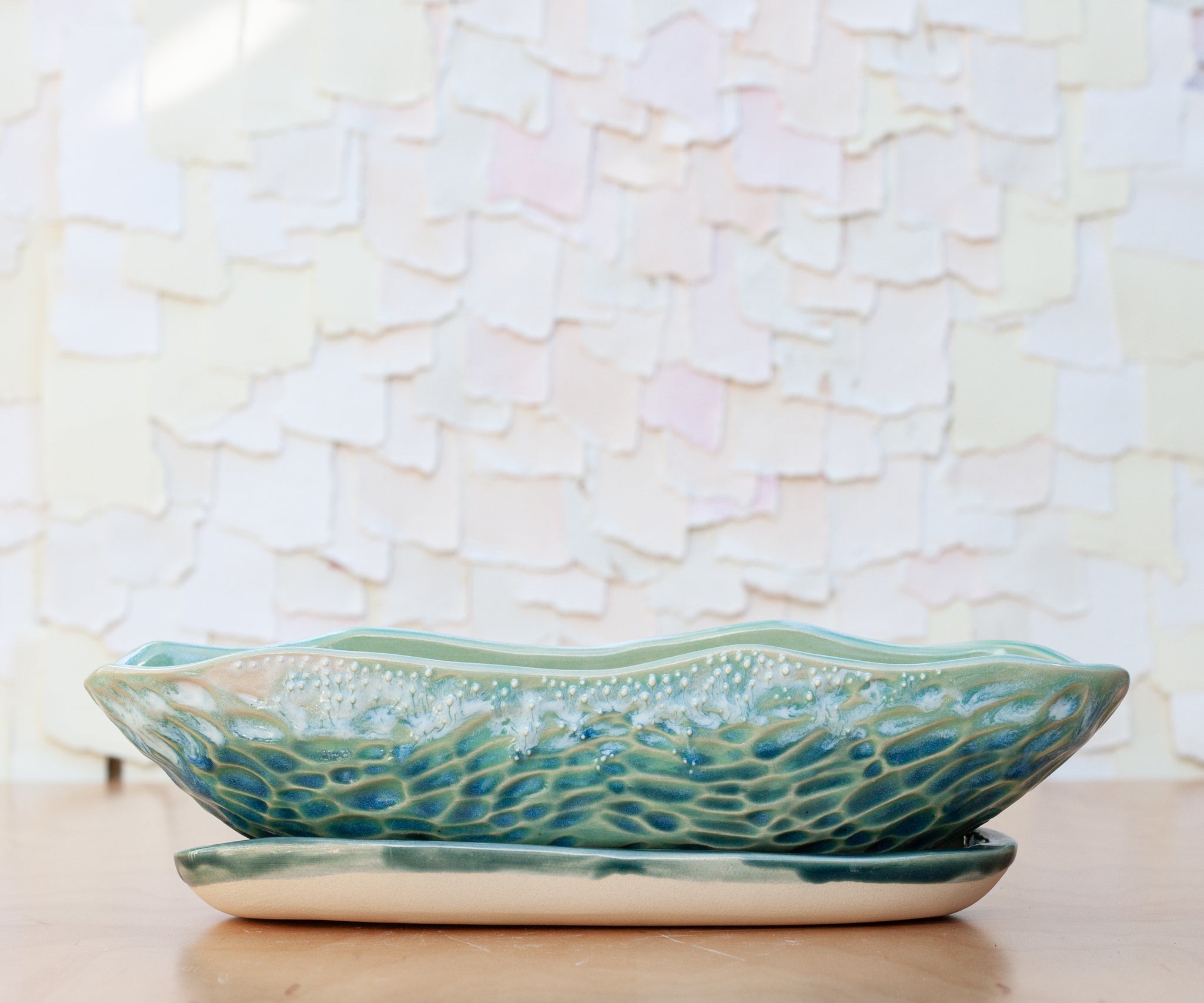 The most magical part of the coast is of course, the ever changing, ever moving sea. It is easy to get lost in it's meditative rhythm. This planter's pattern is inspired from those movements. Glazed in a mix of my favorite blue shades.