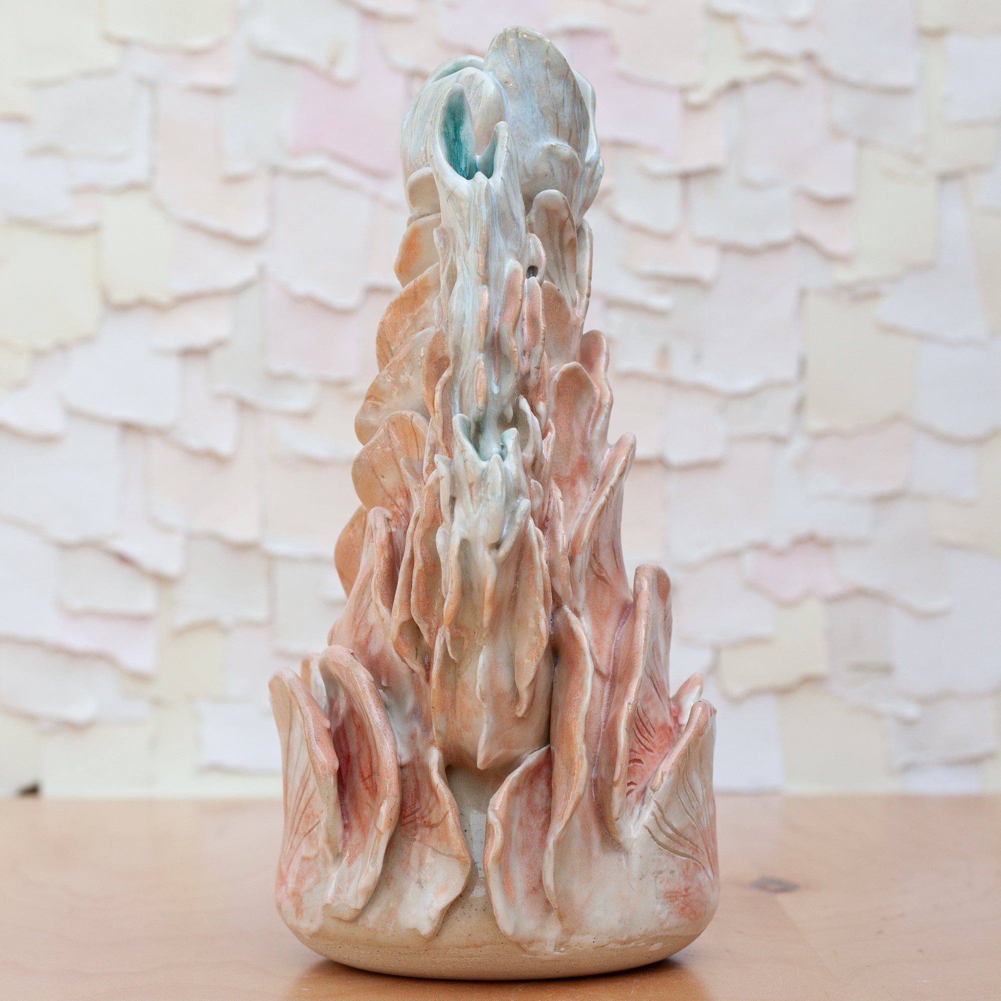 Like a growing reef or a glowing being, this piece was thoughtfully sculpted piece by piece. This stunning piece is a combination of many techniques. Thrown on the wheel, altered and offshoots built to the sides, the texture was then added, layer by layer. A porcelain slip brushed on allows for the glaze to glow.