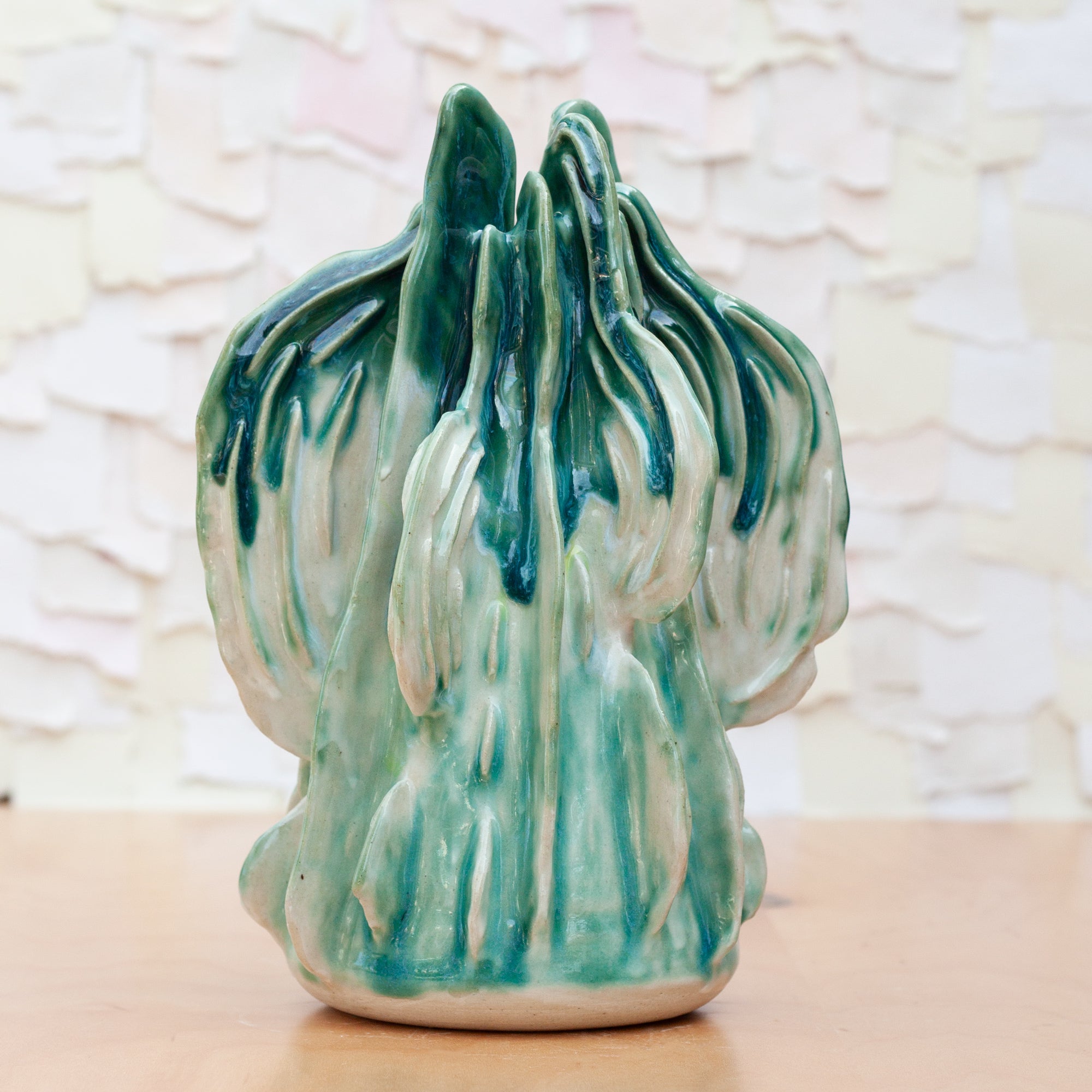 Like a growing reef or a glowing being, this piece was thoughtfully sculpted piece by piece. This stunning piece is a combination of many techniques. Thrown on the wheel, altered and "fins" built to the sides, the texture was then added, layer by layer. A porcelain slip brushed on allows for the glaze to glow.